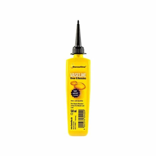 HANSELINE – Vaseline påføres tyndt på de overflader, der skal behandles, som krom- eller korrosionsbeskyttelsesfedt. Især skibsbeslag og aluminiumsdele, som er meget udsat for saltvand, bør regelmæssigt vedligeholdes med vaseline, men naturligvis også cykler i vejtrafikken, især om vinteren på grusbelagte veje.