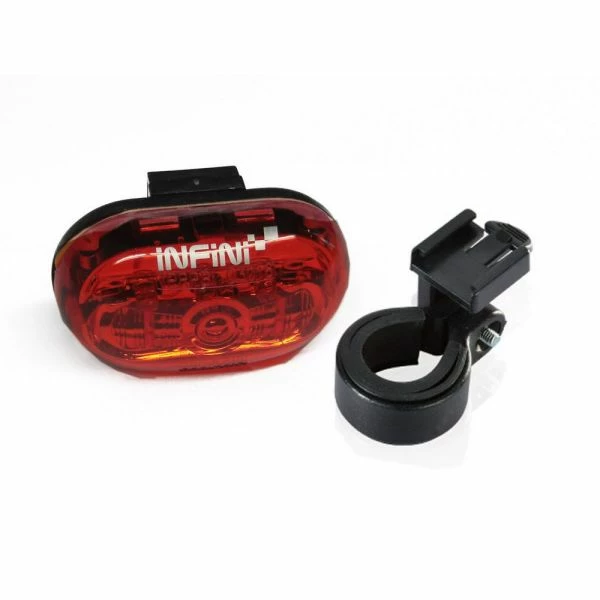 INFINI LED-baglygte I-402 5 LED’er (2 side-LED’er for bedre synlighed) Brændtid: 70 timer vandtæt inklusive batteriindikator inklusive batterier (2x AAA) inklusive beslag ø 25-32mm Vægt: ca. 24,5g (uden batterier) Dimensioner: 66 x 40 x 35mm godkendt til landevejscykler under 11 kg eller som ekstra belysning med godkendelse, i overensstemmelse med tysk StVZO.